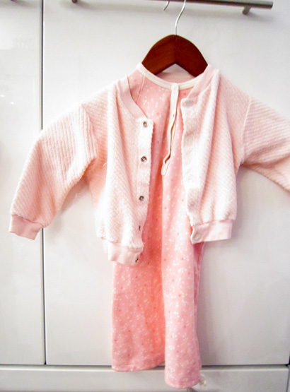 Vanhempani ovat säästäneet muutamia minun ja sisarusteni vanhoja vauvanvaatteita. Nyt me sitten kaiveltiin kätköjä ja löytyihän sieltä pari kivaa juttua, jotka nappasin Rebekalle käyttöön. Minä en ole oikeastaan mikään lastenvaatefriikki. Tykkään kyllä pukea lapseni siististi, mutta en käytä aikaani suunnitelemalla vaatekokonaisuuksia tai mietiskelemällä, että minkä merkkinen haalari seuraavaksi ostettaisiin. Meillä ei ole kuin yksi sopiva mekko, hameita 0 kappaletta!
